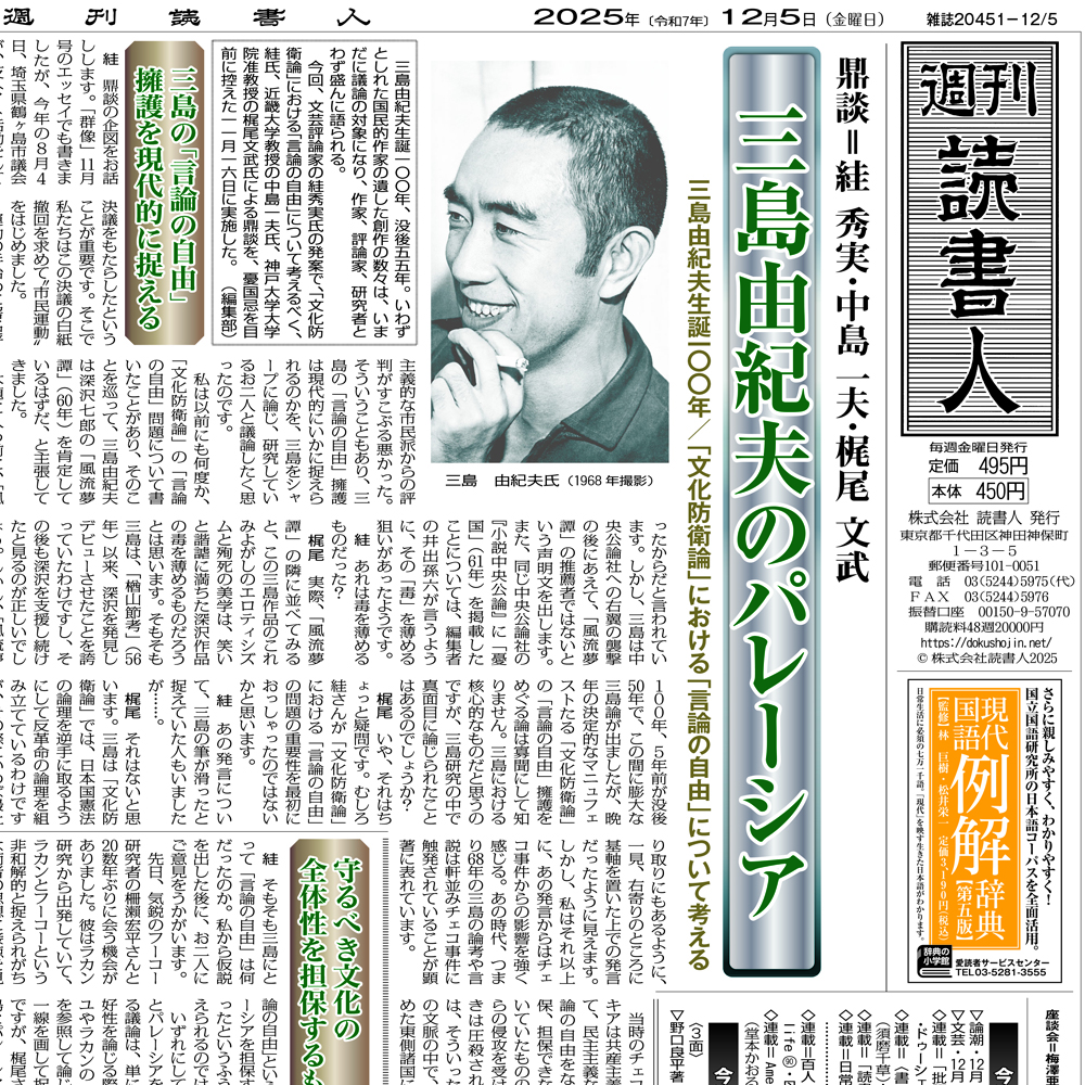 今回、文芸評論家の絓秀実氏の発案で、「文化防衛論」における「言論の自由」について考えるべく、絓氏、近畿大学教授の中島一夫氏、神戸大学大学院准教授の梶尾文武氏による鼎談を、憂国忌を目前に控えた11月16日に実施した。(編集部)