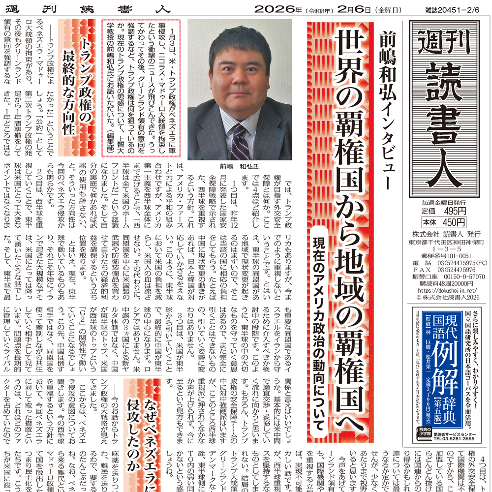 1月3日、米・トランプ政権がベネズエラに軍事侵攻し、ニコラス・マドゥーロ大統領を拘束したという衝撃のニュースが飛びこんできた。うってかわってその後、グリーンランド領有の意向を強調するなど、トランプ政権は何を狙っているのか。現在のトランプ政権の思惑について、上智大学教授の前嶋和弘氏にお話いただいた。(編集部)