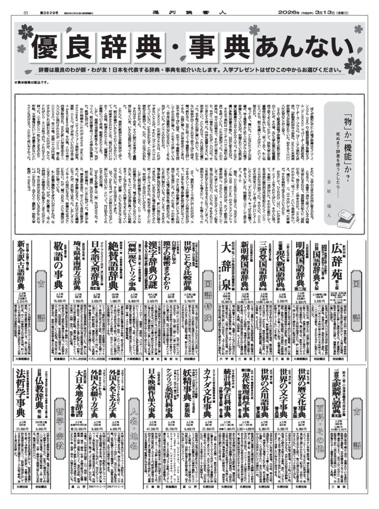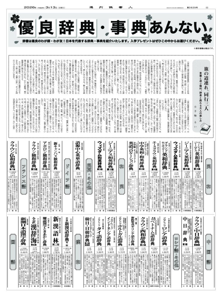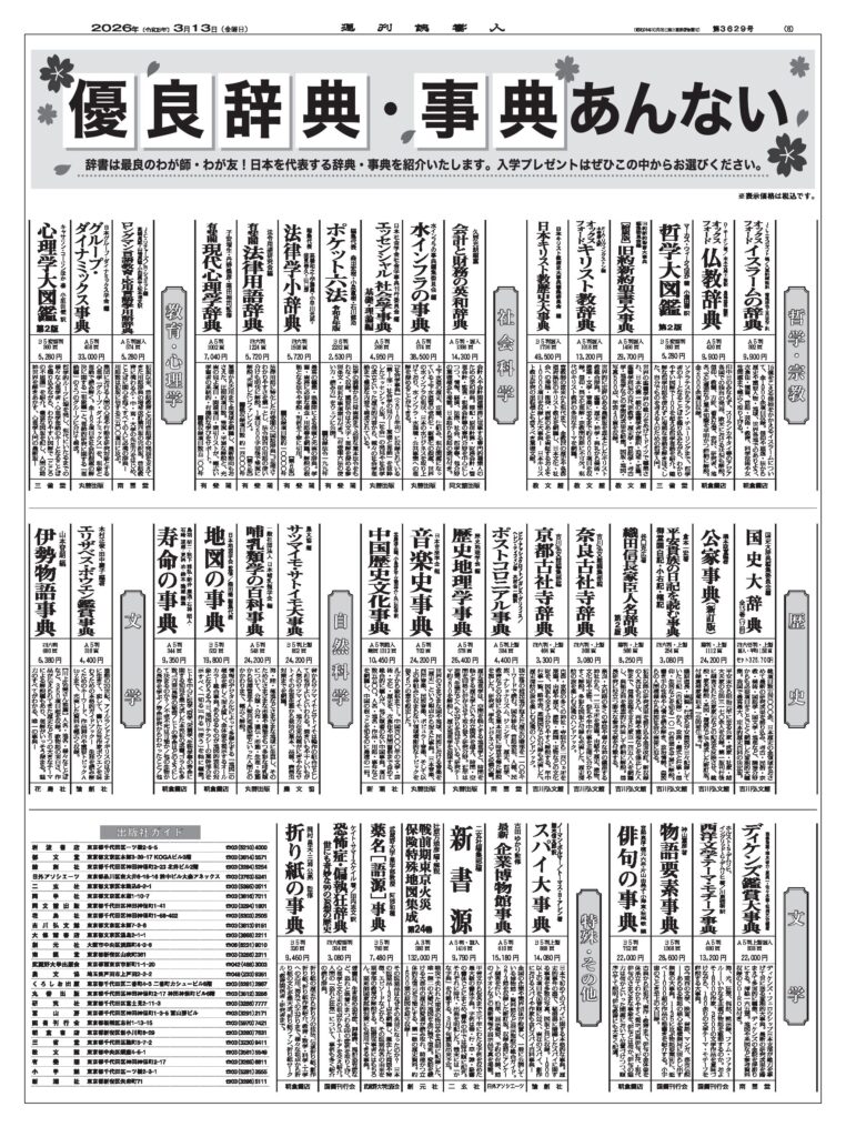 今年も新年度、入学時期恒例の「優良辞典・事典あんない」をお届けします。週刊読書人2026年3月13日号では、日本を代表する辞典・事典を一挙にご紹介しております。こちらでは、紙面の特集6~8面を全て無料で公開。入学プレゼント、大人の学びなおし、新しい辞書との出会い…等、ぜひこの中からお選びいただきお役立てください。以下の画像をクリックすると拡大表示されます。